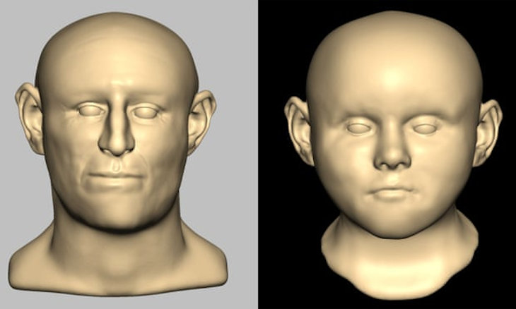 Based on skeletal remains, researchers reconstructed the face of a male adult and a child. Composite: Prof Caroline Wilkinson/Liverpool John Moores University