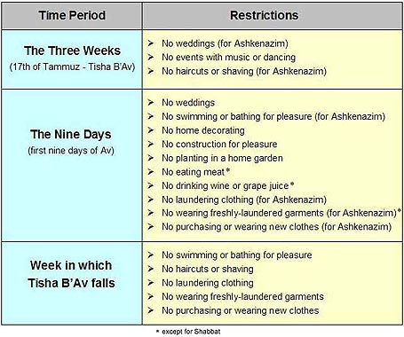 During this time, we minimize joy and celebration. And since the attribute of Divine judgment is acutely felt, we avoid potentially dangerous or risky endeavors. Also, various aspects of mourning are observed by the entire nation. Read on for details...