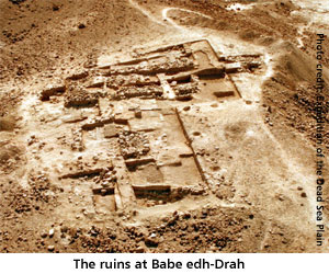 By 1924, the previously doubtful Albright became convinced of the possibility of some ancient inhabited area near the barren eastern bank of the Dead Sea. His expedition had found some meager remains of an early Bronze Age structure assumed to have been a fortress or temple. It was located on a mound, known as Bab edh-Dhra, overlooking the desert floor some 550 feet below. Albright assumed that the structure was in some way to be identified with the Sodom-Gomorrah story, but was uncertain what that connection might be.
