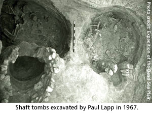 No serious excavations were undertaken in the area until about 40 years later. In the 1960s, a large cemetery was discovered near Bab edh-Dhra. Archeologist Paul Lapp spent three seasons excavating the area where he unearthed a great number of shaft-tombs -- possibly as many as 20,000. (A shaft-tomb is a vertical hole, about 3 feet in diameter, dug into the rocky ground to a depth of approximately 6 feet.) At the bottom of each shaft were 1-5 horizontal shallow shafts, each containing between 1-6 bodies. In addition, there were a number of mud-brick buildings, charnel houses that are repositories for bones or bodies of the dead. Each charnel house contained the remains of several hundred people.