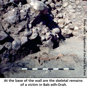 Numeira was excavated for two seasons and the foundations of a few homes were uncovered. Perhaps the most interesting find was the remains of a winery with 4000-year-old whole grapes were still there, preserved by the arid desert climate. In latter years Moses referred to the vineyards of Sodom,For their vine is of the vine of Sodom and of the fields of Gomorrah; their grapes are grapes of gall, their clusters are bitter. (Deut. 32:32) The other three "cities" of the area have yet to be excavated. Surrounding the archeological ruins of Safi is an Early Bronze cemetery which rivals the size of Bab edh-Dhra. About nine miles south of Safi is the next of the five cities, Feifa. A cemetery has been found there too. The burial grounds of Feifa are similar in size to that of Babe edh Dhra and Safi. [6] As noted above, the cemetery of Bab edh-Dhra is reported to contain the remains of 500,000 individuals. The cemetery in Safi seems to hold the same number of corpses, another 500,000. The grounds of Feifa hold another 500,000. The cemeteries of Numeria and Khanazir have yet to be located; however, the known number of burials in this relatively small area of the Dead Sea Desert -- 1,500,000 bodies -- indicates that this was once a thriving, heavily populated area. Indeed, it does seem to be incredible, yet the evidence is there. Based on this dating of the pottery of the grave goods in Bab edh-Dhra, it seems that this city existed for about 1,000 years. Numeira, on the other hand, existed for a very short span of time, certainly less than 100 years. The Talmud (Babylonian Talmud Shabbos 11a) says that Sodom existed for a mere 52 years. This would make Numeira a likely candidate for Sodom.