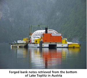 With defeat staring them in the face, the Nazis packed up all their paraphernalia, including printers' plates and counterfeit bills, into crates which they dumped into Lake Toplitz, the deepest, most isolated lake in Austria.