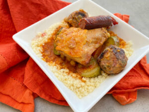 Heat oil in large Dutch oven and brown the veal. Sprinkle on potato starch and stir to coat. Add garlic and saute for a few minutes. Add remaining ingredients. Simmer, covered for 1-1/2 – 2 hours, until veal is tender. Serve over mashed potatoes (if you’re Sephardic, this would be good with rice). |