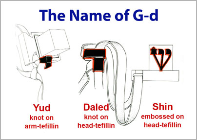 The outer structure of the Tefillin contains three Hebrew letters, which spell out God's name, Shadai: