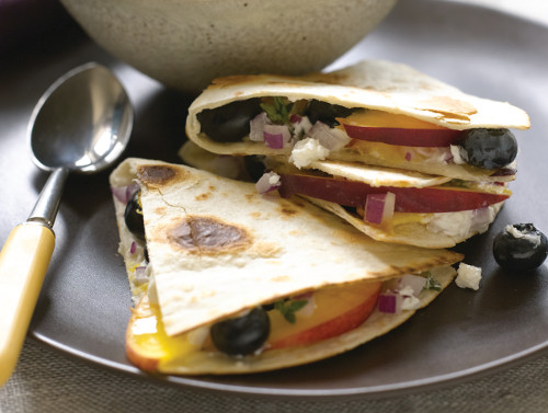 My Blueberry and Cheese Quesadillas make for a lovely summer lunch. Filled with blueberries, sliced peaches, goat cheese, red onion and thyme you can savor them warm or at room temp. In Israel (or anywhere else for that matter) you can skip the blueberries and instead add sliced plums, strawberries or even pitted cherries.