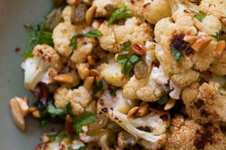 While the cauliflower cooks, heat remaining teaspoon of olive oil in a small saucepan over low heat. Add almonds and stir until lightly browned. Remove from heat and add raisins to warm through. When the cauliflower is done roasting, stir in the almonds, raisins, parsley and lemon juice. Best served warm.