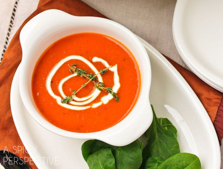 Using an immersion blender, puree soup until smooth and creamy. Serve warm. Garnish with drizzle of non-dairy milk and fresh herbs