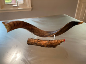4. Cut a slit in the third toilet paper roll, roll it so one end is smaller, and fit the end of this roll into the second toilet paper roll. You should now have a curved shofar shape made up of the three toilet paper rolls tucked into each other, resembling a shofar. Wrap the entire “shofar” with lots of masking tape to hold everything in place.