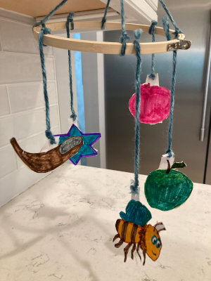 1. On Rosh Hashanah it’s traditional to eat various simanim, signs, to express our hopes that we have a good new year. One famous Rosh Hashanah siman is apples dipped in honey, signifying a sweet new year. Other simanim include pomegranates (just as a pomegranate is full of seeds, we hope to be full of mitzvahs), the head of a fish (signifying the “head” of the new year) and carrots. Brainstorm ways you can make your own, personal simanim for your mobile: maybe hearts (to signify love and friendship), books (to represent a great school year) or flowers (to represent beauty and sweet odors).