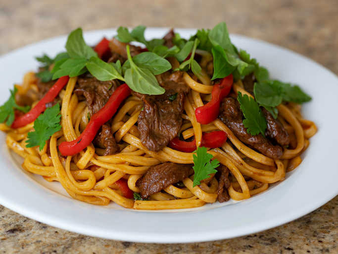 Savor the bold flavors of tender beef, stir-fried noodles, and vibrant peppers in this irresistible Thai-inspired dish that’s as colorful as it is delicious.