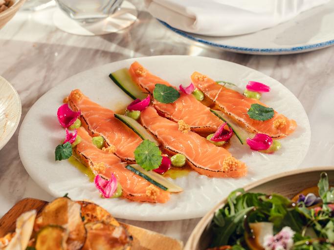 Silky cured salmon with fresh dill and citrus, clean, elegant flavors that set the tone for refined kosher dining at SLS Playa Mujeres.