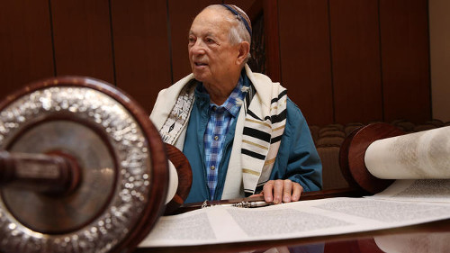 Delayed by the Nazis, Harold Katz is the first person to read from the Torah Scroll he has dedicated.