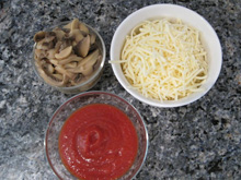 For each blintz, spread sauce over the top half of the blintz wrapper no more that an inch and a half from the edge. Top with shredded cheese and mushrooms. Roll and fry as directed above.