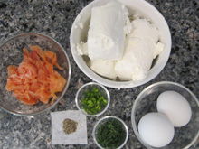 SMOKED SALMON AND GOAT CHEESE BLINTZ FILLING AND SOUR CREAM DILL SAUCE WITH CHIVES :