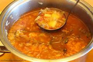 In a large soup pan put the brisket, bone, salt and water. Bring slowly to the boil, then skim the surface using a wet metal spoon. Add the onion, tomatoes, sugar and pepper. Bring to the boil, reduce the heat until the soup simers, cover and cook for a further 2 hours, or until the meat is almost tender. Discard the bone. While the soup is cooking, finely shred the cabbage, put it into a colander and sprinkle with some coarse salt. When the meat is almost tender, pour a kettleful of boiling water over the salted cabbage to take away any undue cabbagey flavor. DRain the cabbage and add to the soup.