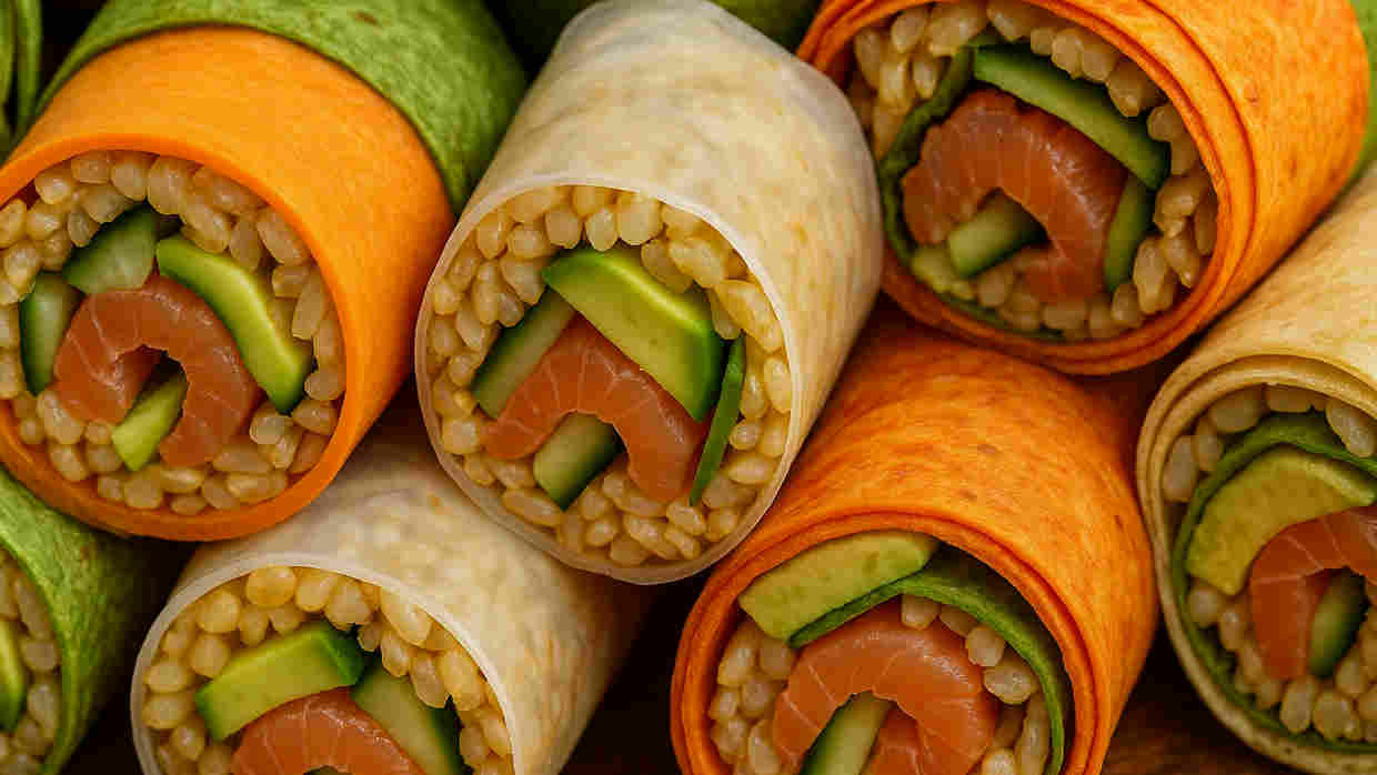 An elegant take on your favorite sushi (with no seaweed!), these rolls are a perfect light weeknight dinner, Shabbat or Yom Tov appetizer, or a beautiful and tasty addition to a get together with friends. These rolls are made healthier with the addition of short grain brown rice, and super healthy vegetables. The multi-colored tortilla wraps are a colorful addition to your table. You can even wrap these with thin strips of cucumber or carrot for a flavorful, striking and low calorie treat – with a little kick!