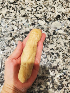 - Take the third piece and roll it into a thin rope, about the width of a number 2 pencil. Using a non-serrated knife, cut the rope into half-inch pieces. The pieces will look like little pillows. Cover the pieces you’re not currently working on with plastic wrap. If the dough gets too dry, microwave it for a few seconds.