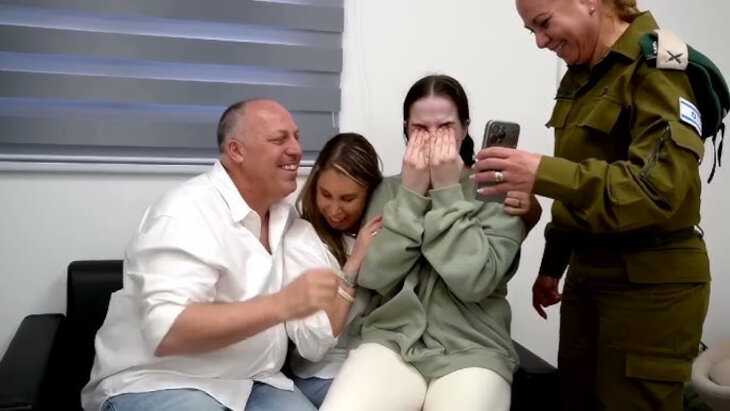 Agam was also reunited with the four IDF lookouts with whom she was held together in captivity. The young women, who had been released the week before, waited for Agam in the hospital, prepared welcome signs for her, and received her with a warm embrace.