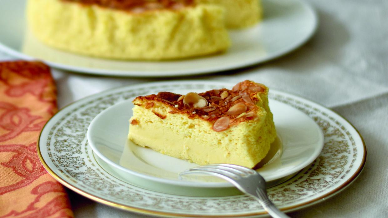 - Bake for 35–40 minutes until the almonds turn a golden brown. Then, switch off the oven but do not open the oven door immediately. Leave the cake to cool down inside it. (If you take out the cake too quickly, the height will reduce to half and the soufflé effect will disappear.)