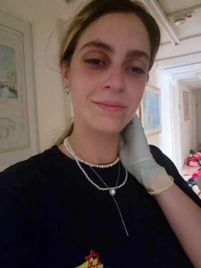 At one point we write, "Amit, send us a photo of what's going on, we want to see you!" She sends us a selfie, and we can see the dark circles under her eyes. She has this halfsmile, like she's forcing herself to smile for us, for her family, and mainly for Mom. Behind her, you can see this trail of blood, and the corridor is full of wounded people just lying there. Horrifying. Later, we found out that at the same time, she sent another photo of herself to her best friend Lital, and in that photo she's crying, sobbing, and she writes to her, "God, I'm so scared.”