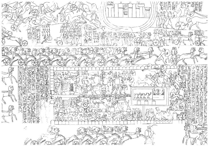 But in its telling of the exodus, the Torah appropriates far more than individual phrases and symbols. In fact, it adopts and adapts one of the best-known accounts of one of the greatest of all Egyptian pharaohs. The paramount achievement of Ramesses II (reigned 1279-1213 BCE) – known also as Ramesses the Great--occurred early in his reign, in his victory over Egypt’s arch-rival, the Hittite empire, at the battle of Kadesh: a town located on the Orontes River on the modern-day border between Lebanon and Syria. It is believed to have been the largest chariot battle in history. Upon his return to Egypt, Ramesses inscribed accounts of this battle on monuments all across the empire. Ten copies of the work, known as the Kadesh Poem, exist to this day. These multiple copies make the battle of Kadesh the most publicized event in the ancient world. Many Egyptologists believe that the Kadesh Poem was a widely disseminated “little red book,” aimed at stirring public adoration of the valor and of Ramesses the Great.