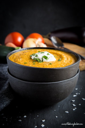 Place in the oven and roast, uncovered, for 30-35 minutes, or until soft and browned. Once cooled, scrape out the eggplant flesh and remove skin from peppers and tomatoes. Add vegetables to the bowl and use an immersion blender to puree eggplant, peppers, zucchini, tomatoes, garlic and onion until chunky like a salsa, not completely smooth.