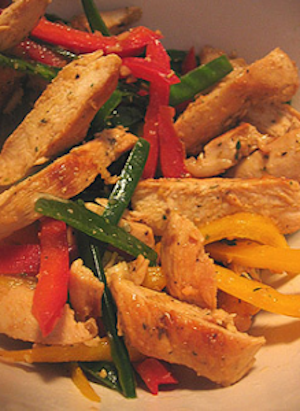 Slice the chicken on a diagonal. Place the chicken and its juices in a large bowl. Add the lemon juice, olive oil, cucumbers or asparagus, peppers, lemon slices, salt and pepper.