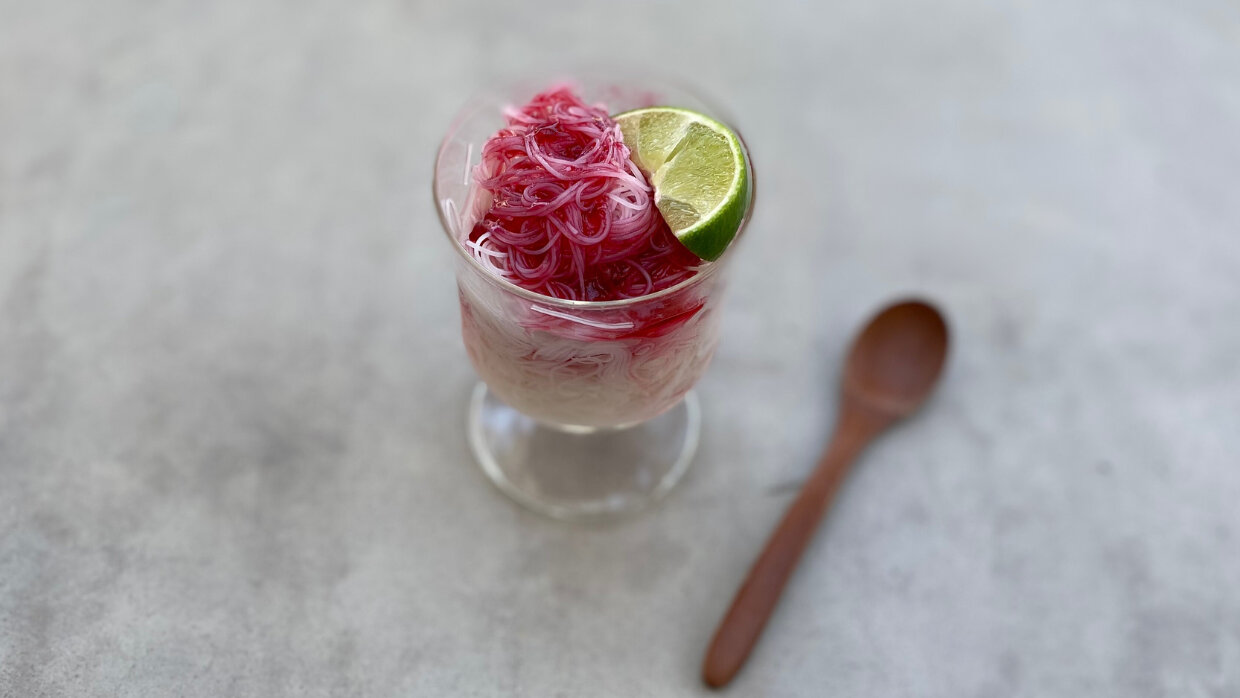 As time went on, Persians began to mix homemade noodles called faludeh into the ice, adding a unique texture and maintaining their pristine white color. Today, we commonly use rice sticks, also known as rice vermicelli or mei fun, to recreate this effect. The noodles blend perfectly with the sweetened shaved ice, while a touch of lime juice counteracts any soapy hints from the rose water.
