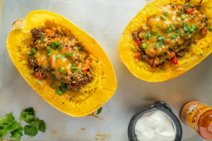 A twist on traditional taco meat, stuffed into our family favorite, roasted spaghetti squash. Cheese pictured here is vegan and non-dairy so it can be used with meat, but feel free to omit. The original version of this recipe appeared on an episode of The Kitchn.