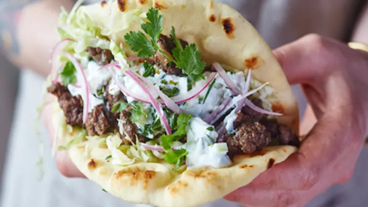 Add the beef or lamb and season with 1/4 teaspoon of the salt. Break the meat up into smaller pieces and sauté until cooked through and browned, about 10 minutes. Meanwhile, heat the naan and make the tzatziki.
