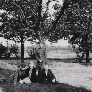 Käthe Heusermann and Fritz Echtmann (sitting on the ground) with Soviet officers (Photo courtesy Lyuba Summ)