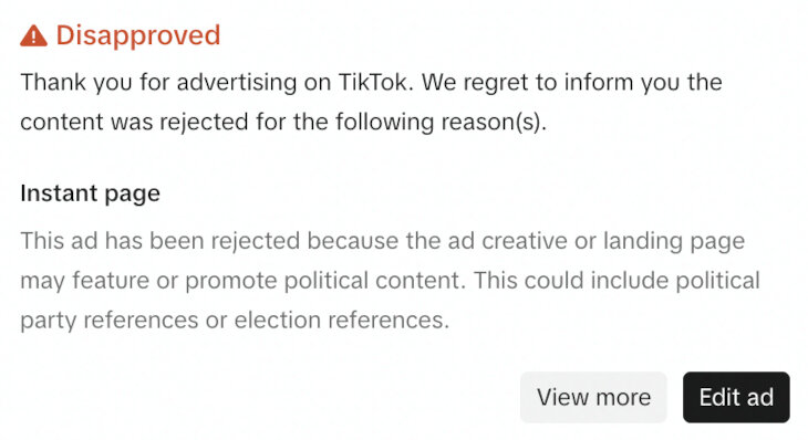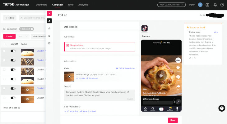 Our ads had been rejected because “the ad may feature or promote political content.” Challah didn’t seem very political to me, so we tried to appeal the claim, but our appeal was rejected.