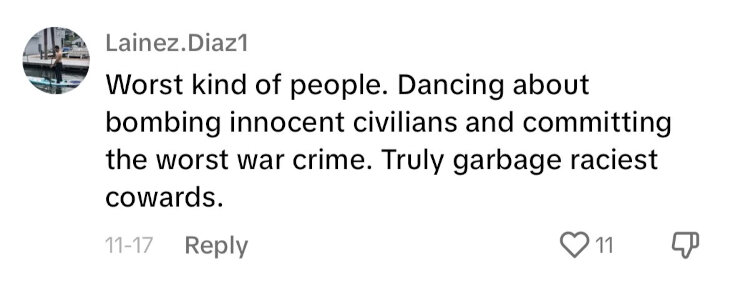 I don’t have a Tik Tok account, only Instagram and Facebook. On Instagram, some of my comments were flagged for possible violations. They contained word like this, “ Hashem bless them🙏🇮🇱🇮🇱✡️✡️🇵🇦🌼🦋. I was suspended for 48 hours from commenting while under review. After Nov 23, I am allowed to comment now. Meanwhile I see so many hateful comments from people who claim to want to Free Palestine.