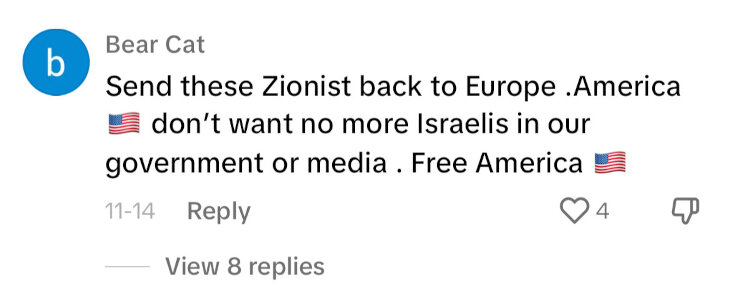 Whether it’s TikTok moderators, social media commenters, or antisemitic influencers, we will continue to stand up for what is right and fight hatred. This is our moral duty. Am Yisrael Chai.