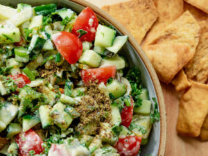 Finally, it helps to get creative. The real fun comes in adding herbs and seasonings. When you’re shopping for ingredients, take a look at what’s fresh and consider incorporating new flavors and textures in your salad. Herbs like dill, parsley, mint or cilantro are great additions, as are vegetables like peppers, radishes, kohlrabi, pickled lemons or anything else that catches your fancy. Dressing the salad with lots of freshly squeezed lemon juice and high quality olive oil is key. Some chefs add spices such as lemony-flavored sumac or the Israeli spice blend known as zaatar. Some add tahini paste or cheese. Anything goes. The recipes below will help get you started and give you ideas of how to make a version of Israeli salad that’s your very own.