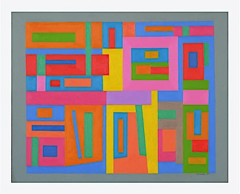 Untitled, by Ad Reinhardt. An extreme departure from his later works, we find a vivid palette of colors that engages the viewer. Fair Use license. Wikiart.org