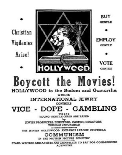 Antisemitism prevailed in the U.S. and in the film industry as well. In the 1930s, a flyer was spread around featuring a gentile girl and a stereotypical image of a hook-nosed Jew that read, “Christian Vigilantes Arise! Buy Gentile; Employ Gentile; Vote Gentile." It goes on, “Boycott the Movies! Hollywood is the Sodom and Gomorrah where international Jewry controls vice, dope, gambling -- where young gentile girls are raped by Jewish producers, directors, casting directors who go unpunished.”