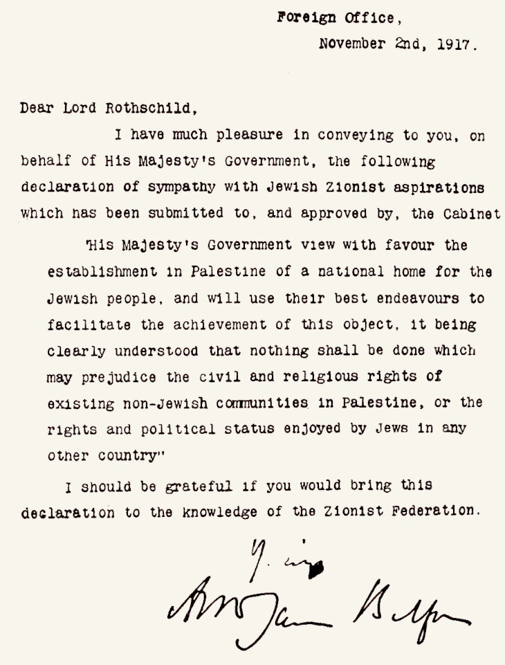 The Balfour Declaration, signed by Lord Balfour. Source: United Kingdom Government signed by Arthur Balfour, Public domain, via Wikimedia Commons