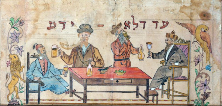 Hasidic Jews celebrating Purim with a Sephardic Jew, Safed, 19th century. Unknown artist.