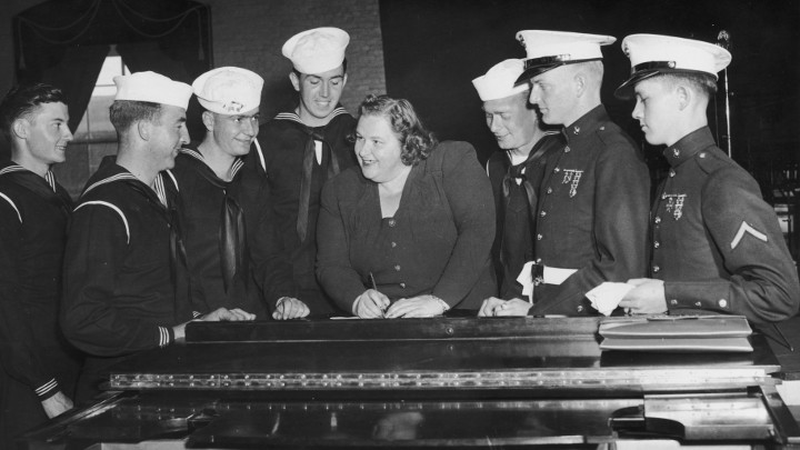 Kate Smith signing autographs for American sailors, 1938.