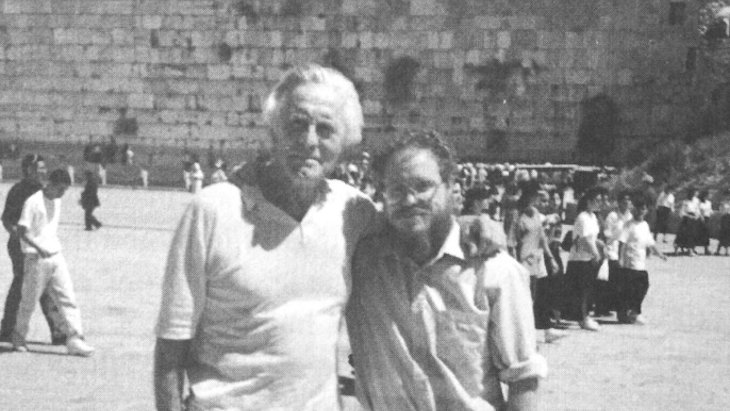 In 1994, Uriela Obst, Kirk’s editor and close friend (whom he called Ushi), visited Israel and studied Judaism at Isralight, a three-week learning program for non-religious adults. She came back to L.A. with glowing reports about the rabbi who led and taught the program, Rabbi David Aaron. Kirk was planning a visit to Israel to dedicate two playgrounds he had donated. Ushi suggested to Rabbi Aaron that he invite Kirk for a Shabbos dinner in his apartment in the Old City of Jerusalem. Rabbi Aaron, who had never heard of Kirk Douglas nor seen any of his films, duly faxed him an invitation. Surprisingly, Kirk accepted.
