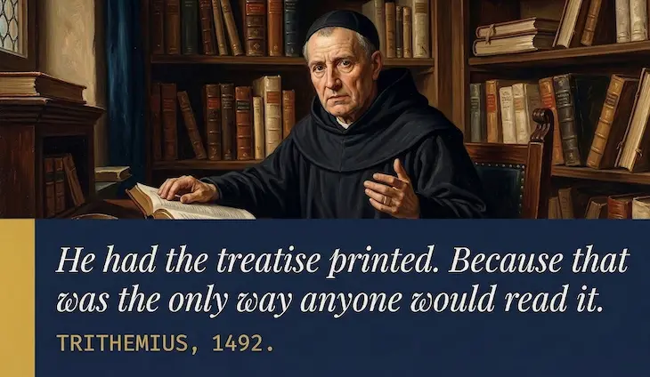 Trithemius was not a fool or a reactionary. He was the abbot of the Benedictine monastery at Sponheim, a serious scholar who expanded his abbey’s library from 40 books to over 2,000. He understood what the printing press could do. He used it constantly for his own work. Thirty printed editions of his writings appeared during the 15th century alone.