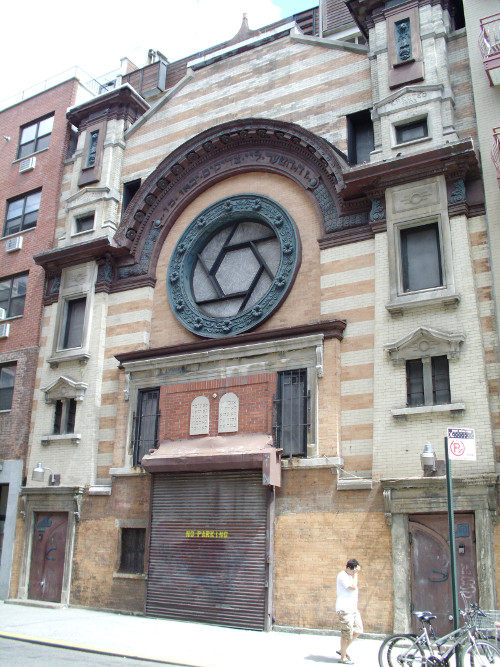 The Lower East Side is a world-famous, legendary neighborhood of American Jewry. This was an eclectically styled synagogue in the area, designed by noted (Jewish) architect Emery Roth. It was built as Congregation Erste Warshawer, and later occupied by Adath Jeshurun of Jassy. But in the 1970s this congregation was on its last legs. Eventually it closed, and now it is a private home and studio. Originally there was a pretty dual staircase but that was removed, and the Jewish star in the round window was modified to resemble a camera lens. But there is still much to identify it as a Jewish site.