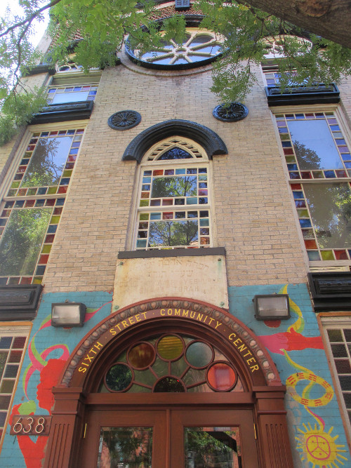 The East Village also was a heavily Jewish area, located just north of the Lower East Side. On East 6th Street between Avenue B and C, there are two lost synagogues side by side. The one at #636 became a church after it closed, but this one at #638 is now the Sixth Street Community Center. It has congregational plaques still on the walls inside. People come here for yoga classes, to eat at a vegetarian café, and other secular activities.