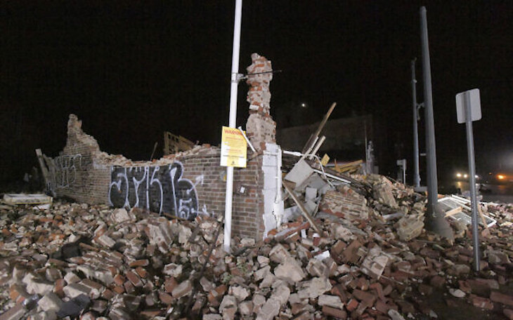 The collapsed historical Karnofsky building is seen on S. Rampart St. in New Orleans, La., early Monday, Aug. 30, 2021. (Max Becherer/The Advocate via AP)