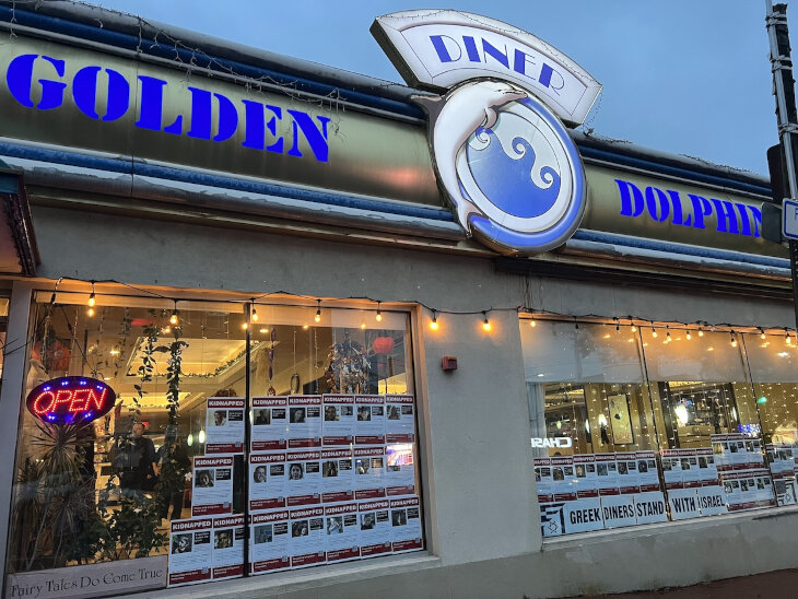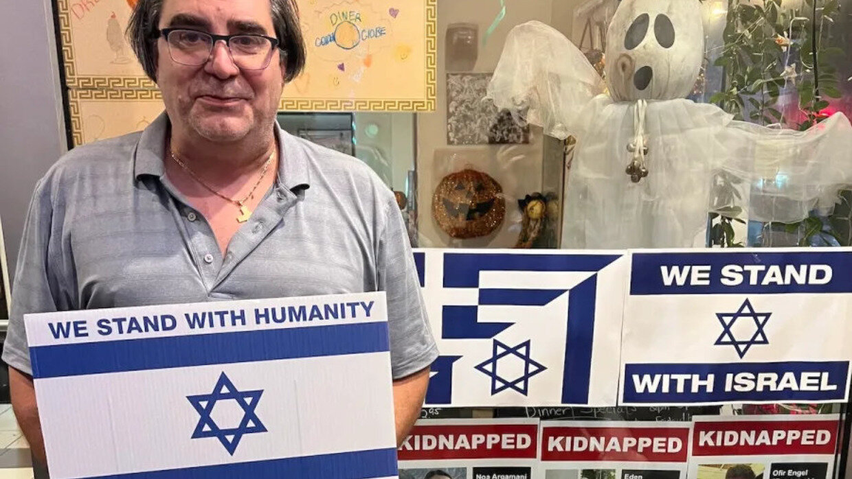 “I put up four Israeli flags around the diner, and pictures of the hostages. I started by posting pictures of the kids under ten years old. There are about 15 of them. I thought to myself, these kids deserve to get home. After doing the kids, I started to put up the older hostages as well, and it filled up about half the window. I figured by the weekend, I would fill up the other half.”