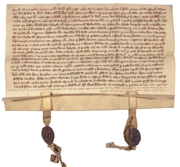 The document shows that a man named Jacob the Jew sold land for the purpose of establishing Merton College. Jacob seems to have worked in partnership with a local official, Bishop Walter de Merton. The deed was likely written by Jacob in his native language, Hebrew. It also contains Latin writing, reflecting the common language spoken by academics in Oxford at the time. While he helped found Merton College, it would have been impossible for Jacob’s sons to study in there. Jews were strictly barred from Oxford and would remain so for over 500 years.