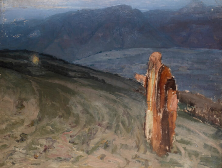 This beautiful painting depicts the scene of Moses at the burning bush where he hears God speak to him for the first time. The bush is but a spark in the distance and Moses seems to be apprehensively approaching it.