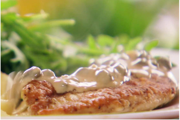 Pan seared chicken that is super soft and light. I serve this at day time meals because it can be made ahead of time and rewarmed without drying out the chicken. It can be made with thin sliced veal too.