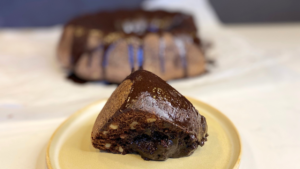This is a meringue torte so its light and filled with chocolate and walnuts. Its deceptively moist and speckled (kinda tweedy) and has no flour or egg yolks. It’s gluten free too. I like it with some whipped pareve (non-dairy) cream on top.